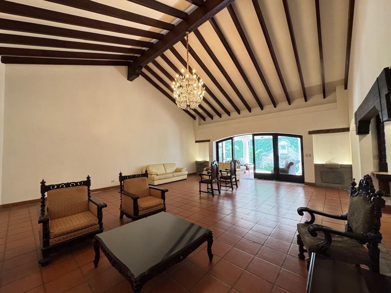 Large living room with a cozy dining area. Both areas open onto the garden terrace.